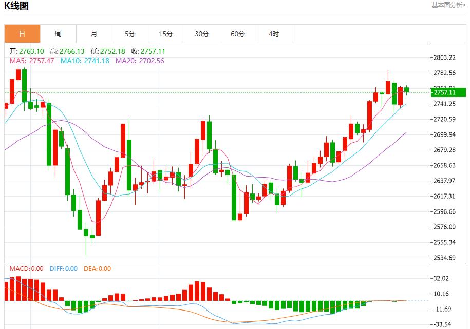 周三盘中,现货黄金报2757.06,跌幅0.22%。