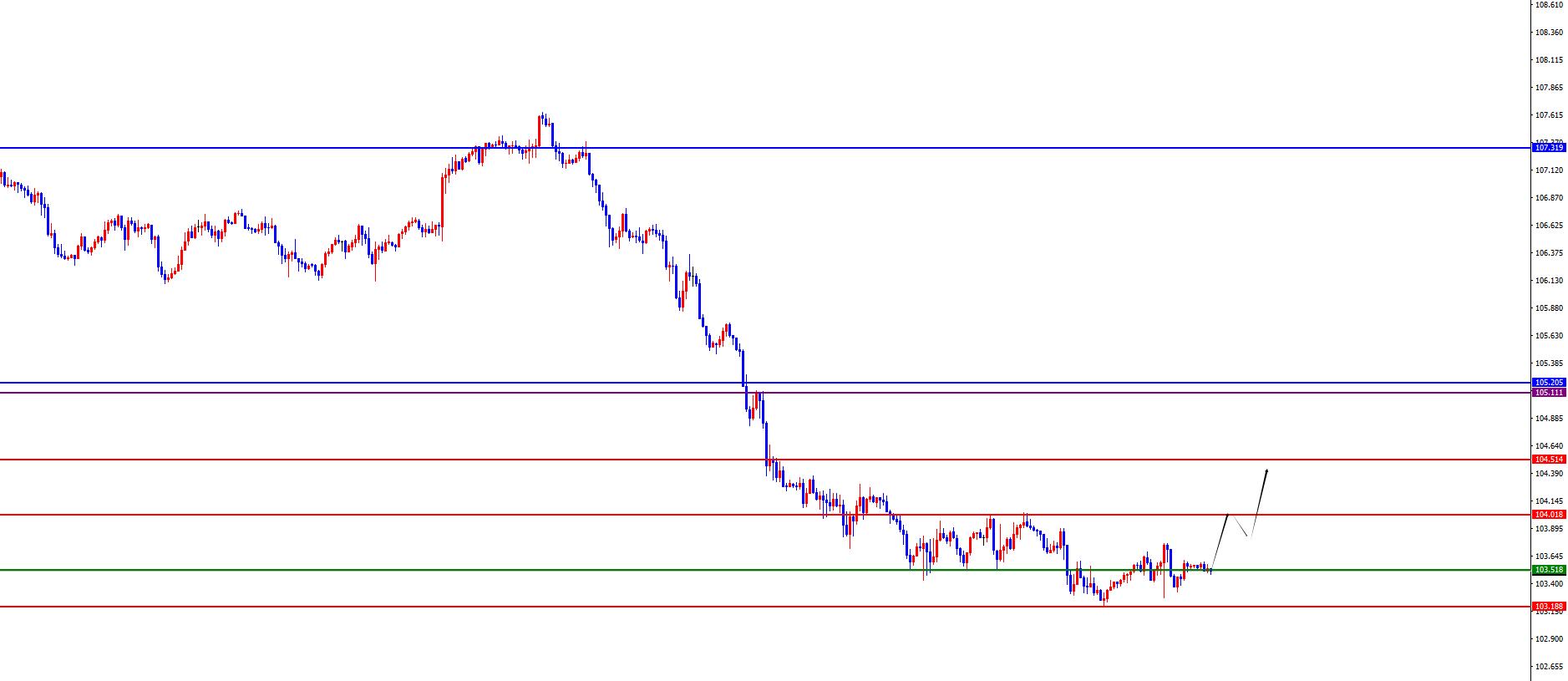 美指上破103.50位置后布局多,防守5美金,目标104-104.50(激进者可以于103.40-50区间直接多)