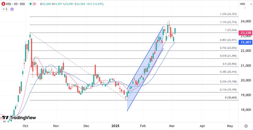 恒指本周继续聚焦人大会议的成果,如果有政策面的利好会继续带来上涨行情,而外围需要留意关税政策对情绪的影响。技术上恒指昨日守住20日均线的情况下今日进一步上破10日均线,所以保留再试区间高位的可能,重点关注24000关口上方的阻力和促成结利的可能。