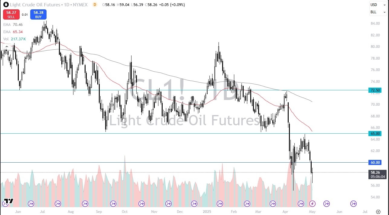 Do not get me wrong, the technical Analysis for this market is pretty dreadful at the moment. However, there is an area right around the $56 level that seems to be massive support, so, if we can break below that area, it would obviously change a lot of things. On the other hand, if we turn around and rally, I’d be watching the $60 level for a major potential barrier. Anything above the $60 level would show true strength, and it would more likely than not take some type of headline to get the markets going. As things stand right now, I think that people are still expecting some type of apocalypse, and that obviously has a negative influence on what people think that demand for crude oil will end up being.