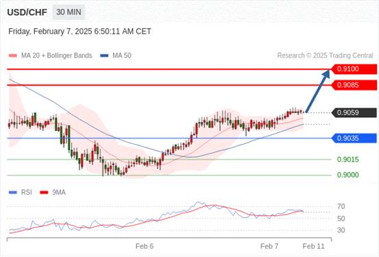 在0.9035之上,看涨,目标价位为0.9085,然后为0.9100。