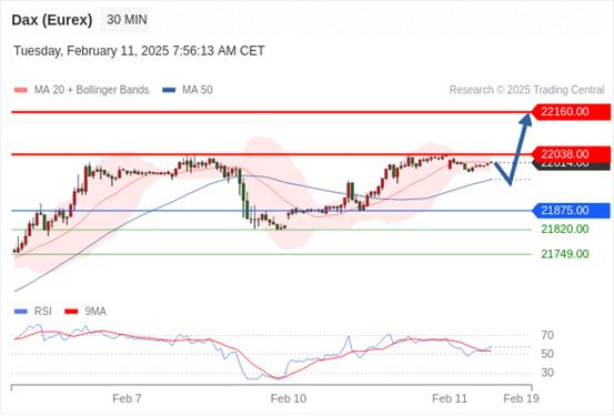 德国DAX指数期货(Eurex)?(H5)?当日内:在21875.00之上,看涨。