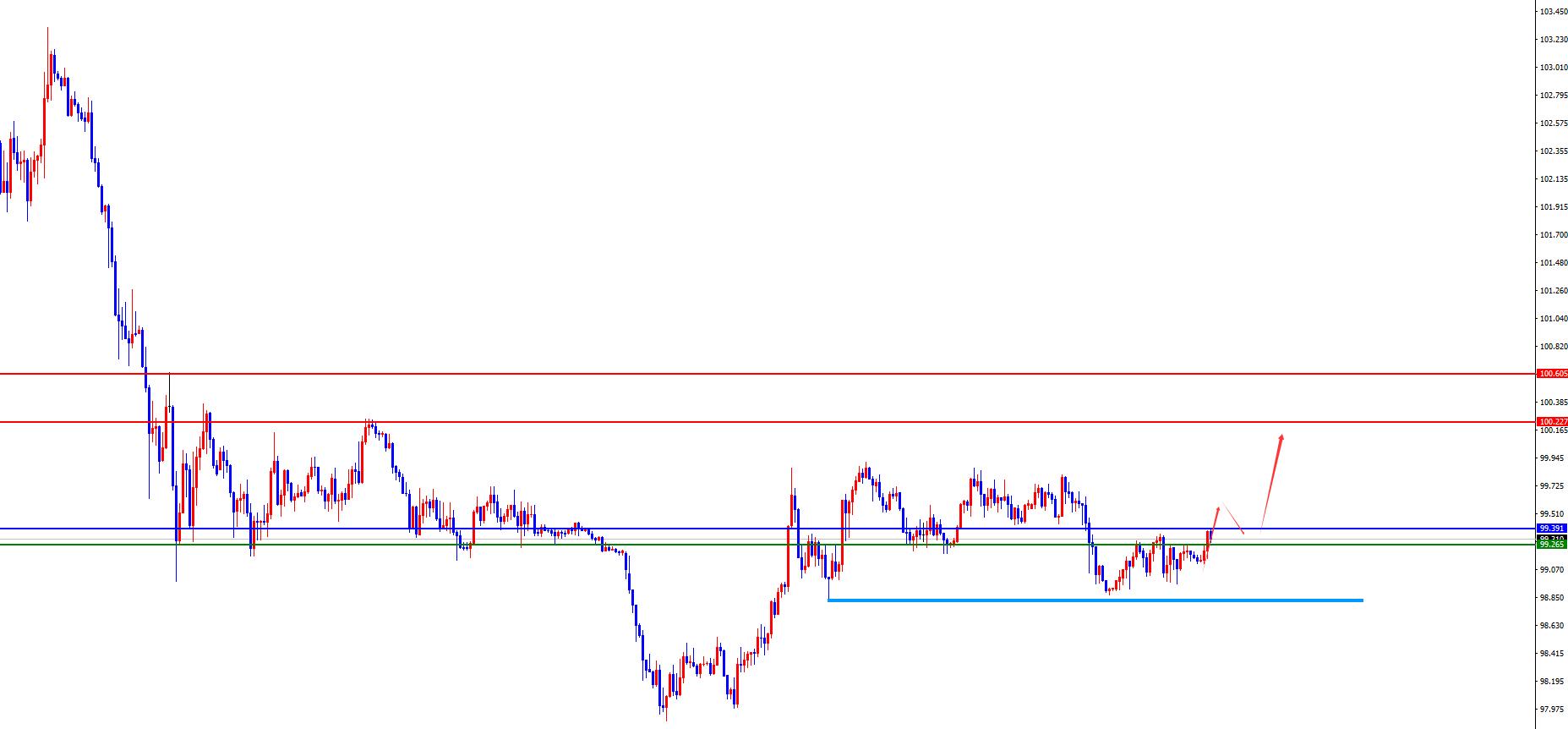 美指99.20-30区间多,防守5美金,目标99.80-100.20-100.60