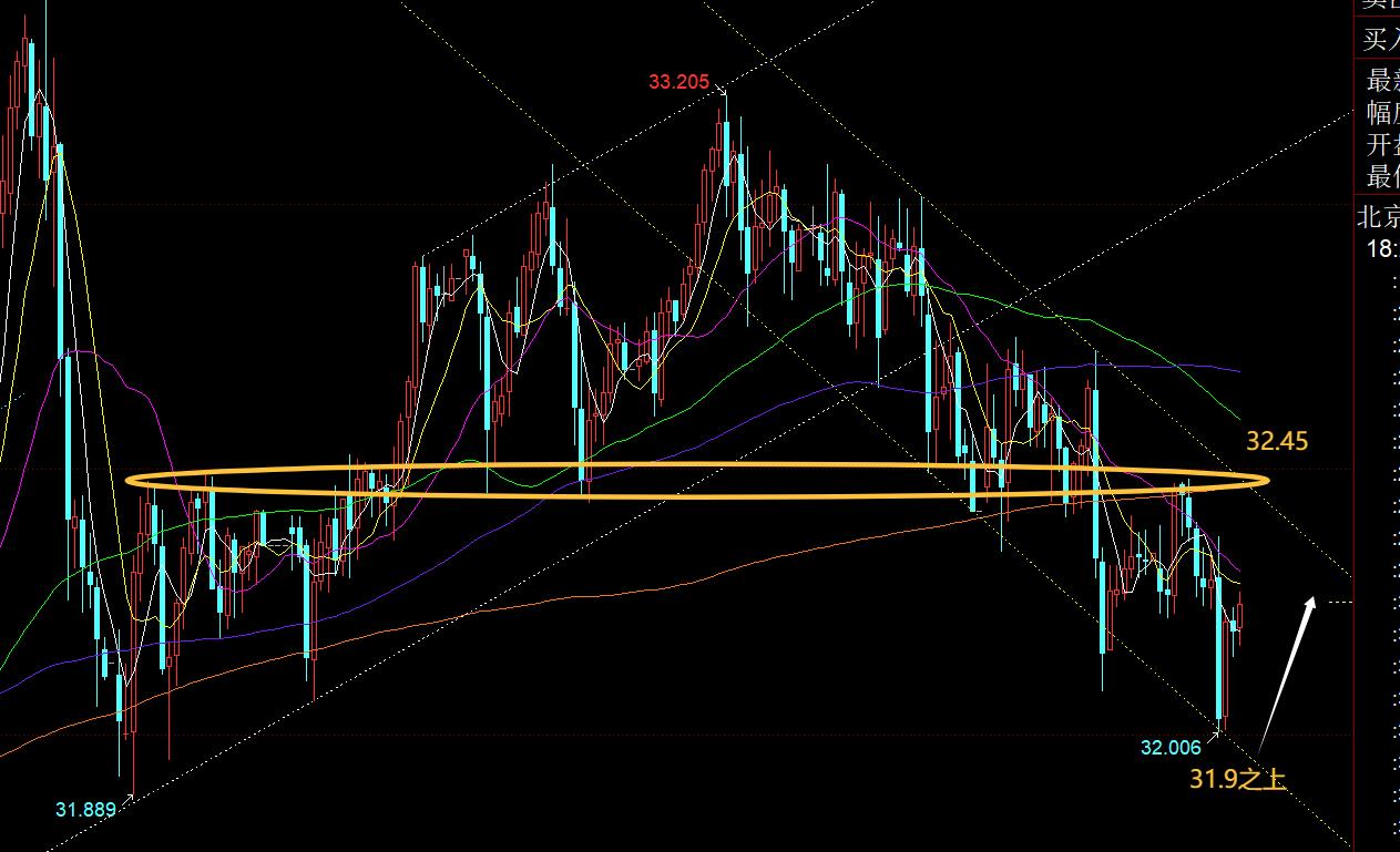 白银方面:日线中轨支撑上移31.9一线,也是前期通道下轨支撑衍生点,原本今日是计划此处去尝试低位看涨,可惜欧盘最低才触及32,差一点;那么今晚来看,32.45一线显然是一个关键承压点,顶底转换点,若能突破站上此处,白银才会走强,结束这一波下行;反之,则需耐心等黄色通道下轨31.9逢低去试探,预计这两日白银随时会出现超跌反弹,因为短周期macd出现量能双背驰;