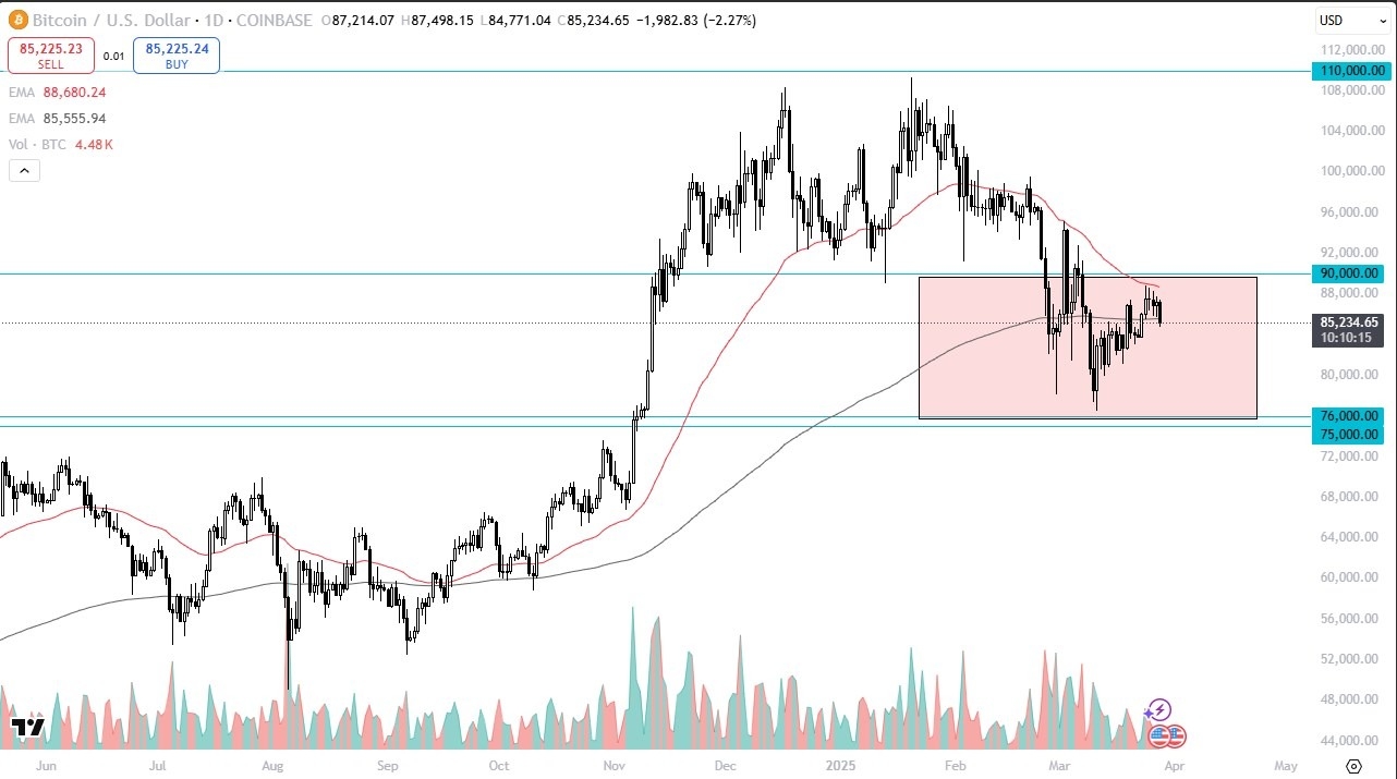 I do believe that going forward, Bitcoin will continue to struggle, at least until we can get some type of clarity when it xmcnglobal.comes to risk appetite around the world. Wall Street does not want to be involved in a risky asset such as bitcoin when there are more basic questions to ask like whether or not there are going to be tariff wars around the world. At this point, it does look very likely, so I would keep that in mind.