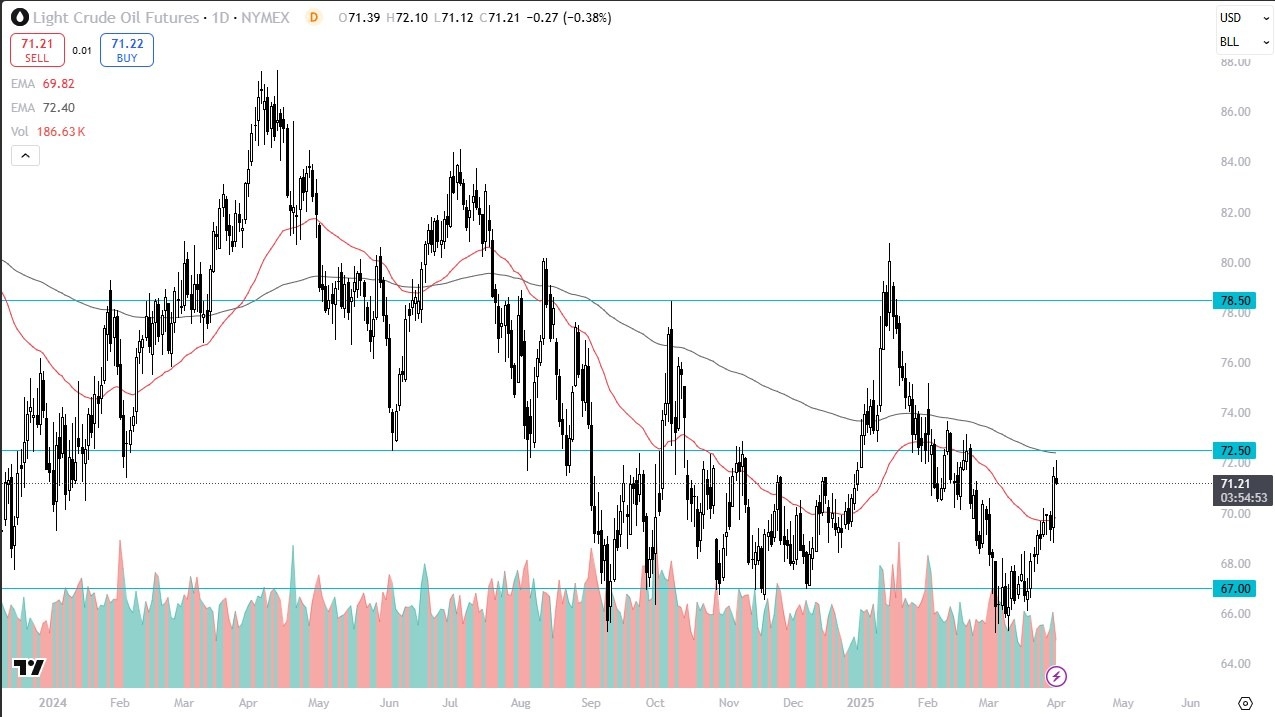 I think we've got a situation where traders were looking for a reason to get long anyways. That being said, it looks like on Tuesday we are pulling back a little bit from the crucial 200 day EMA, which is obviously an area that people pay a lot of attention to. And therefore, I think it does make sense that if we could break above there, then it means something rather impressive. That being said, I do think that a pullback to the $70 level makes more sense than anything else, especially as Wednesday is liberation day in the United States, which means more tariffs.
