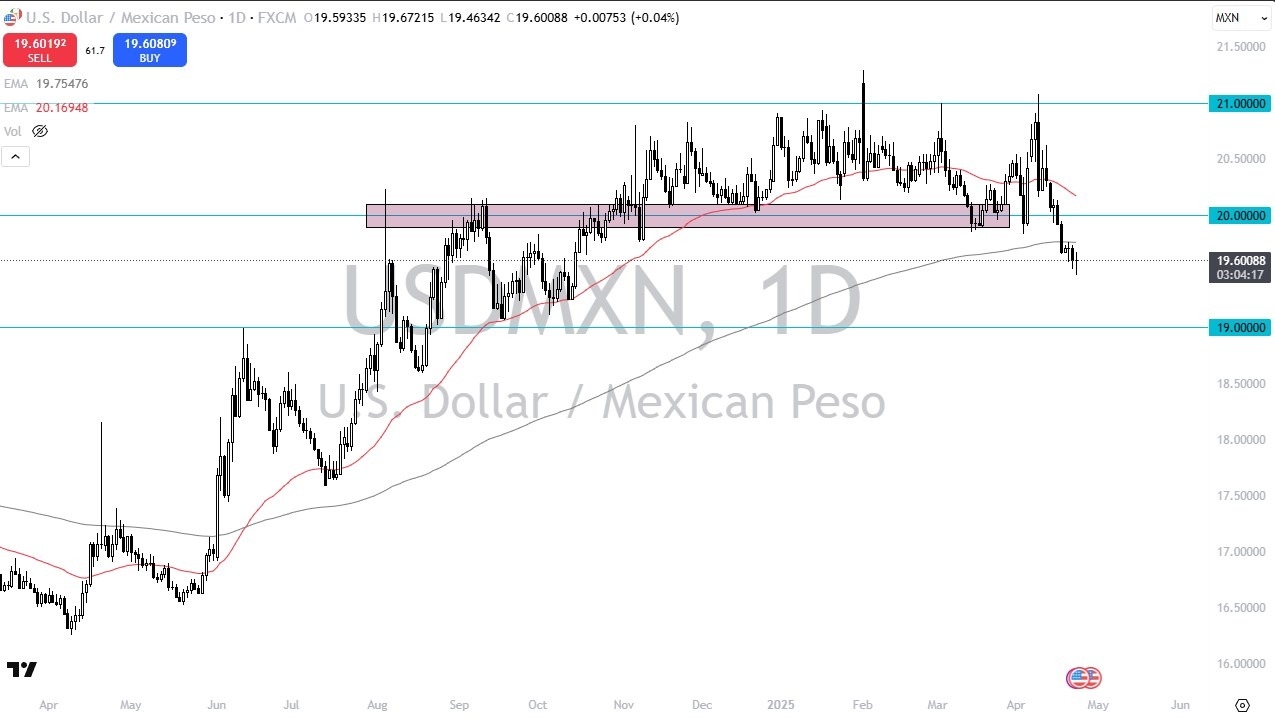 Even mind that the tariff war continues to see a lot of back and forth in this currency pair, as well as many others. The Mexican economy is very sensitive to what goes on in the United States, so if we see the US enter recession, it actually works against the Mexican peso more than it does the greenback. However, the recent selloff in the US dollar against other currency pairs has had an influence on this market. It does look like we are trying to recover in the short term though.