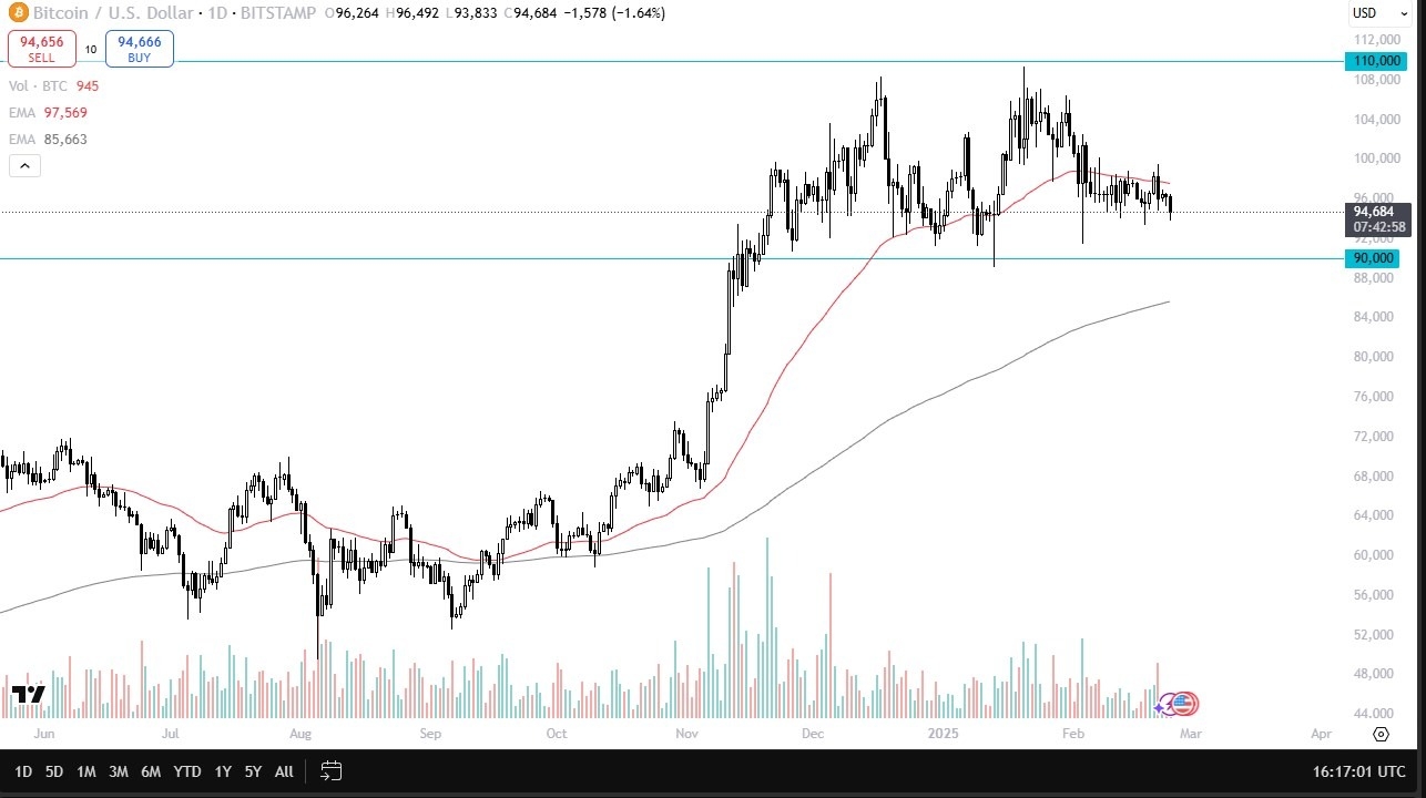 If we were to break down below the $90,000 level, you should keep an eye on the $88,000 level, because I think it’s an entire “zone of support” that we are looking at. Furthermore, the 200 Day EMA is rapidly approaching that area, and could offer a certain amount of support.