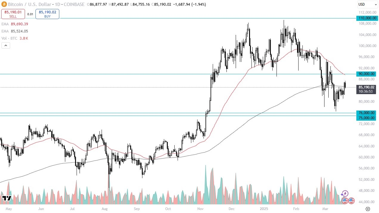 Most traders I know are simply buying little bits and pieces of Bitcoin along the way, in order to “dollar cost average” their way to a bigger position. This of course means that they believe in Bitcoin longer term, and it’s not necessarily a trade for them. However, if you are looking to trade in this market actively, I think at this point in time you have to look at it through the prism of a range bound market between the $75,000 level and the $90,000 level.