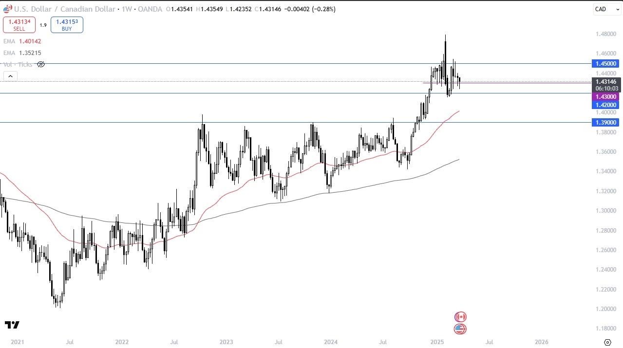 The US dollar has dropped initially during the week, only to turn around and show signs of life again. All things being equal, this is a market that is still very much stuck in a range, and I think it can’t seem to pick up its feet. All things being equal, the market is moving on the latest headlines, and I do think that it continues to favor the US dollar overall, because the Canadians are certainly not backing down, despite the fact that they have very little chance of “winning the trade war.”