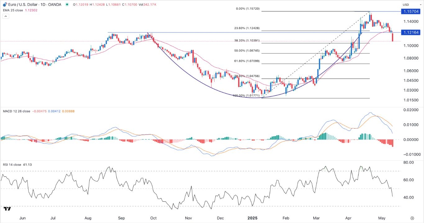 The EUR/USD exchange rate has retreated sharply after peaking at 1.1570 in April. It dropped below the key support at 1.1215, the upper side of the cup and handle chart pattern, a popular continuation sign.